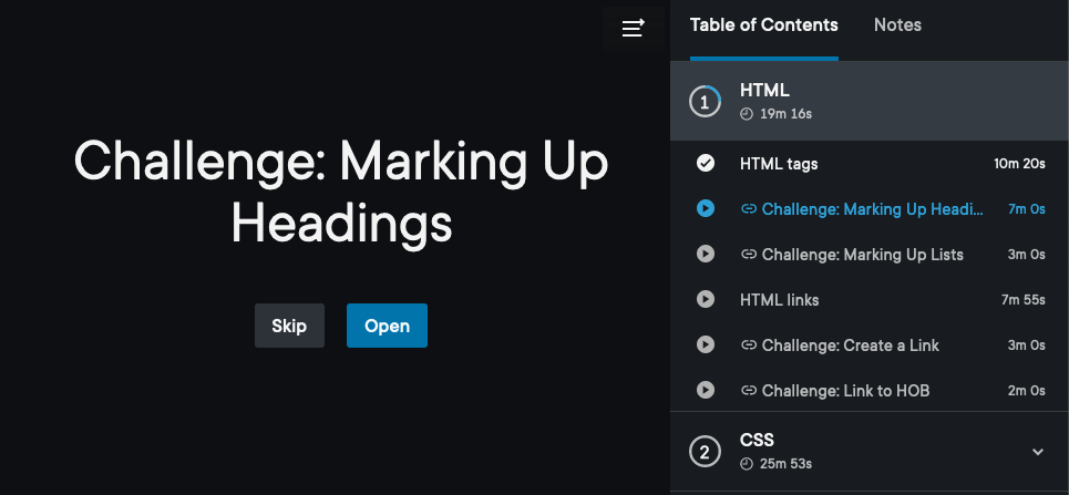 Interactive courses consist of a combination of instructive video clips and coding challenges. The course’s table of contents helps you navigate between the video clips and challenges, and helps you monitor your progress through the course.
